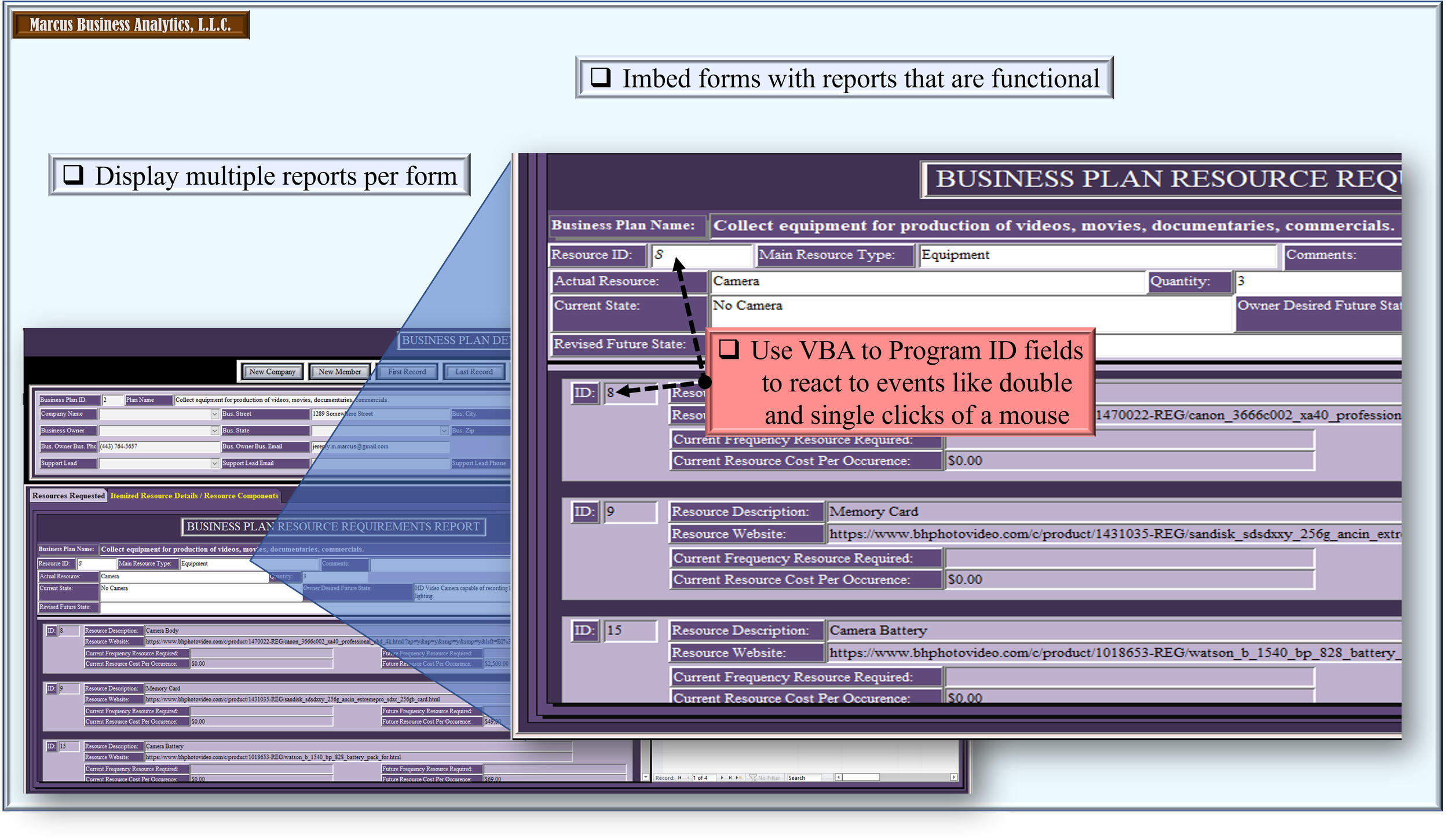 Program fields in tables, forms, reports, and queries to execute commands that allow the user to view and explore more granular details, execute operations such as copying records or sending notifications to others about processes. The potential events are endless.