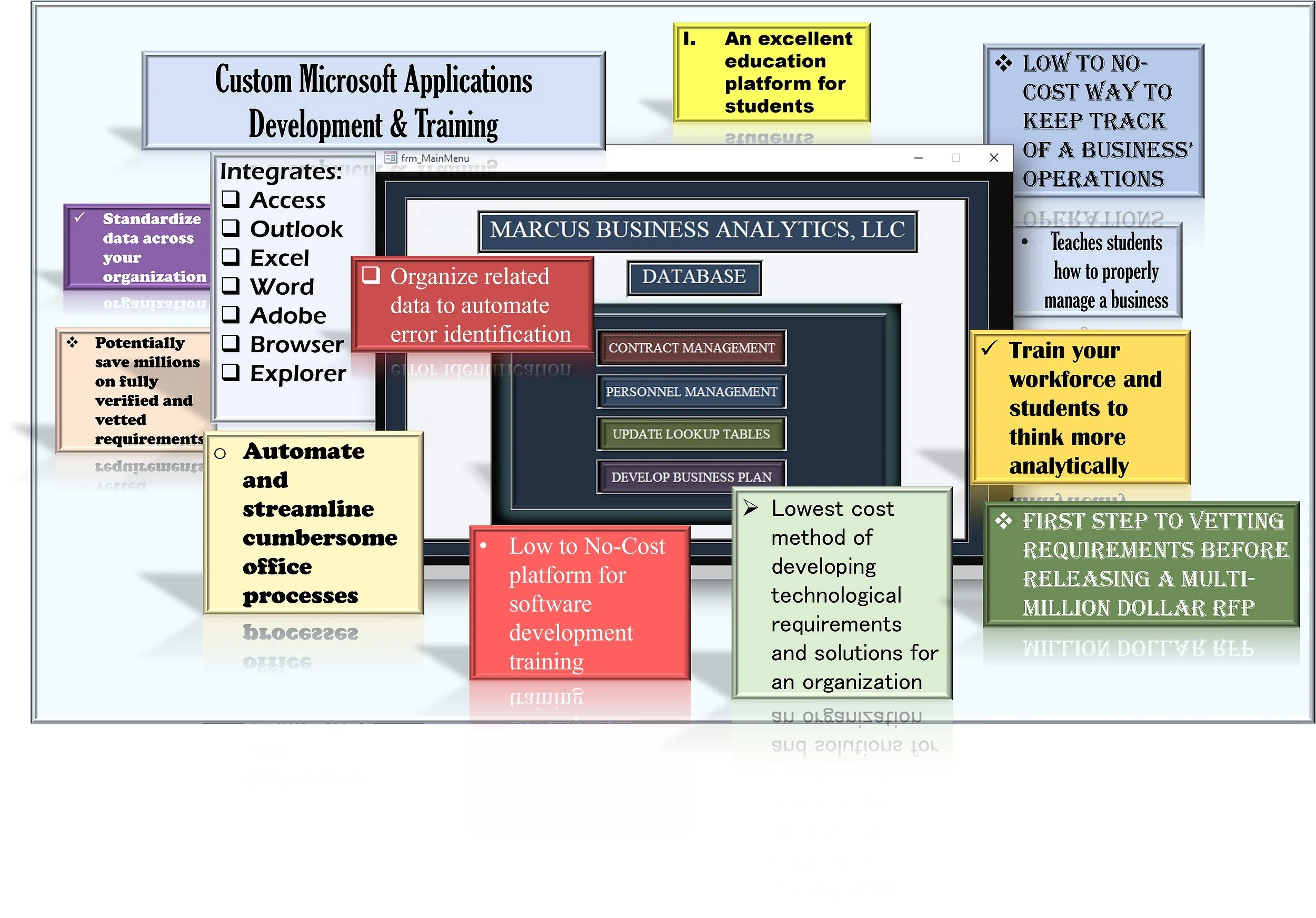At Marcus Business Analytics, we maximize the effectiveness and capabilities of computers running Microsoft Office by integrating the capabilities of each application to satisfy organizational and operational needs. We program manual business operations into the various applications of Microsoft Office, eliminating the need for employees to perform once manual and cumbersome tasks, processes, calculations, and data correlations.